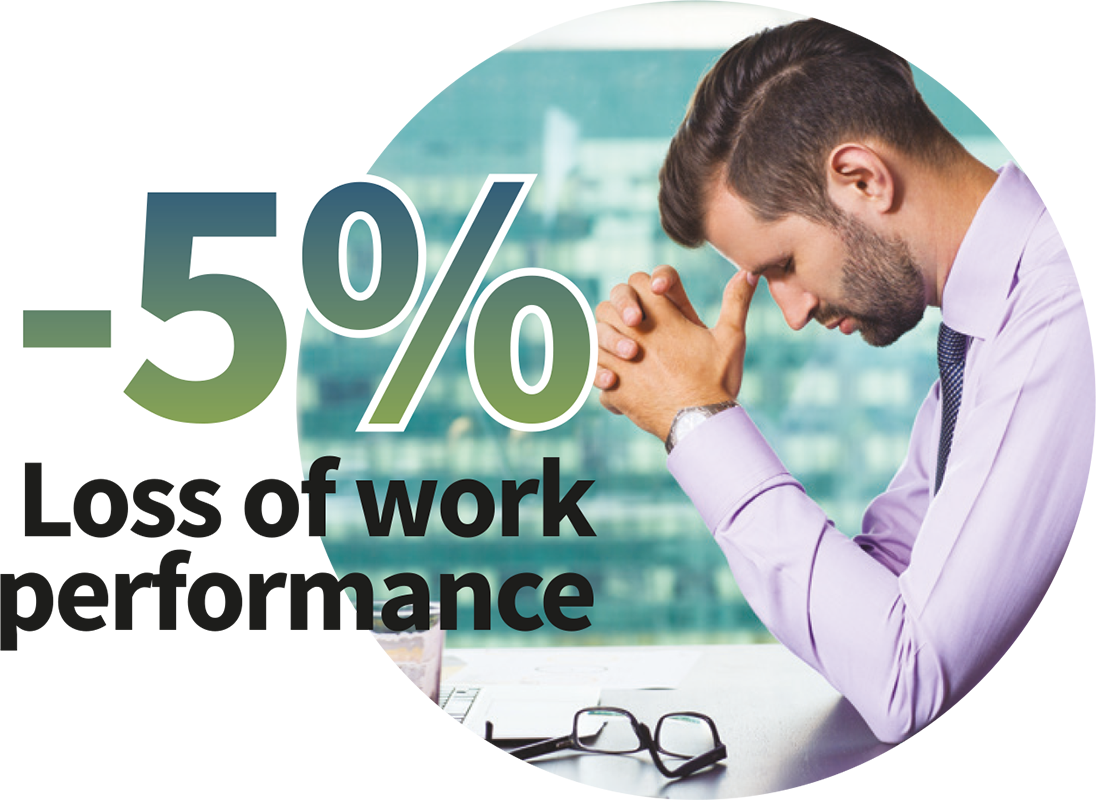 Loss of work performance caused by poor air quality due to increased pollution load/decreased ventilation is experimentally estimated to be ~5%